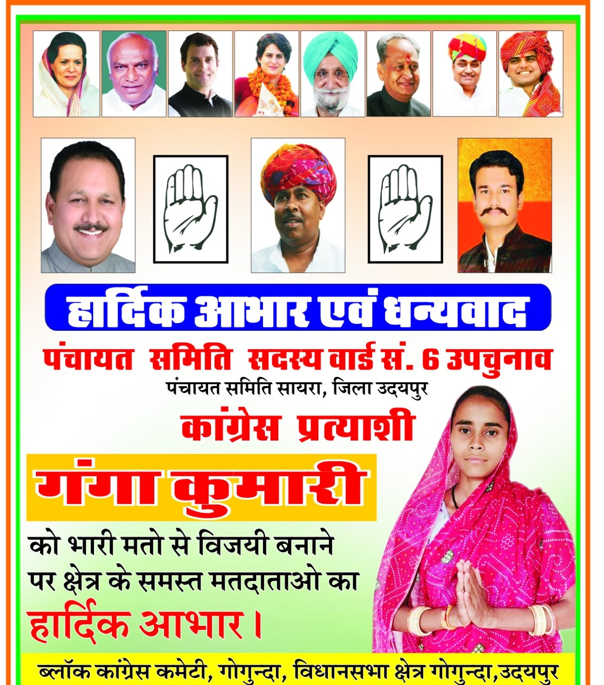 सायरा पंचायत समिति के उपचुनाव में कांग्रेस प्रत्याशी गंगा गरासिया 938 वोटों से हुई विजय
